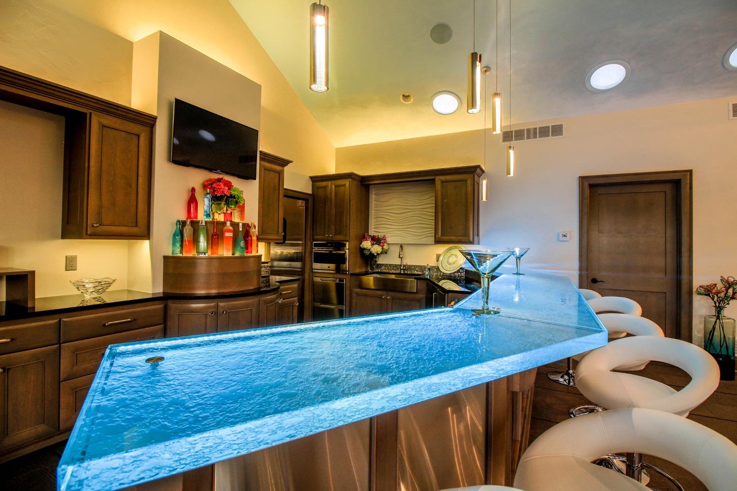 - Dans les résidences, les comptoirs de bar en verre sont devenus une caractéristique haut de gamme dans les maisons de luxe, particulièrement dans les espaces de divertissement et les cuisines extérieures.